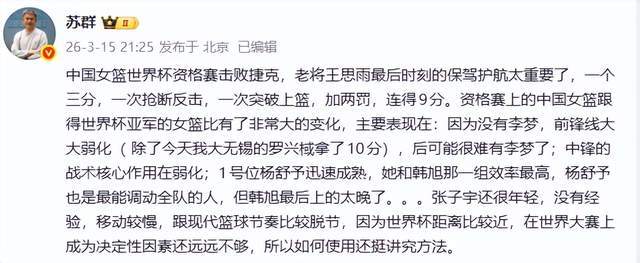 本次世预赛,中国女篮的外线表现难以让人满意,对阵捷克队一役,全队三分球21投仅6中,命中率低至28.6%。名嘴苏群直言,如今的中国女篮与2022年世界杯亚军阵容相比,最大的变化就是缺少了李梦,前锋线实力大幅弱化。李梦作为曾经的锋线核心,拥有出色的持球突破和外线投射能力,在2022年世界杯、2023年亚洲杯等大赛中屡建奇功,她的存在能为球队提供稳定的外线火力,还能通过突破牵扯对手防守,为内线创造更多进攻空间。没有李梦的牵制,中国女篮的内线优势也难以充分发挥,李月汝、韩旭等内线球员常常陷入对手的包夹之中,难以轻松接球得分。